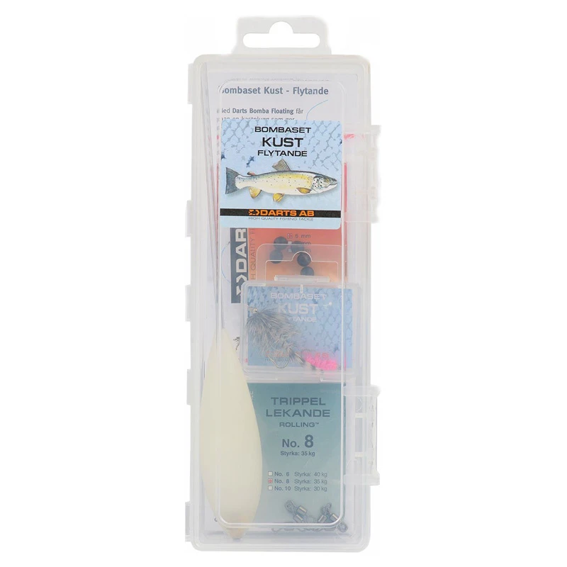 Complete kit met drijvende werpbare dobber, Darts Bomba Floating, rollen, rubberparels en vliegen geschikt voor de kustvisserij.
