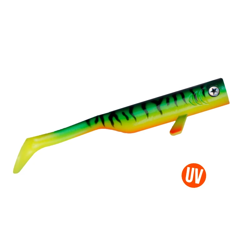 Daarnaast zorgt het vernieuwde staartontwerp ervoor dat er maximale compressiegolven worden geproduceerd en dat het aas intensief van links naar rechts flankt. De constante verandering van de verschillende kleuren op het kunstaas is een extra stimulans voor de vis om aan te vallen, daarom zijn alle aasjes ontworpen met minstens 2 verschillende kleuren.