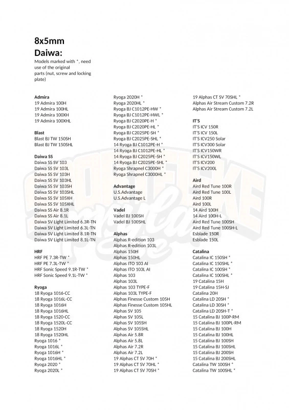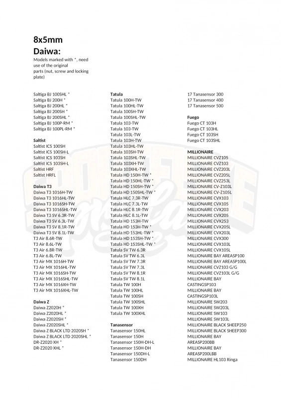 - Shimano SLX Series, Curado Series (behalve CURADO 300k), Calcutta Conquest BFS, Curado BFS, Metanium DC,