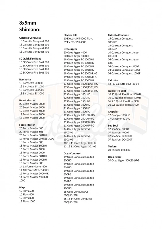 Force Master, Plays, Electric Pill, Ocea Jigger, Ocea Conquest, Calcutta Conquest, Calcutta, Quick Fire Boat, Grappler, Sea Soul, Torium, Ocea Jigger, Tranx 300, 301, 400, 401, Calcutta D 300, 301, Conquest 300, 301, 400, 401, Curado K 300/301
