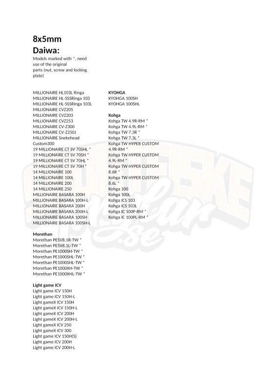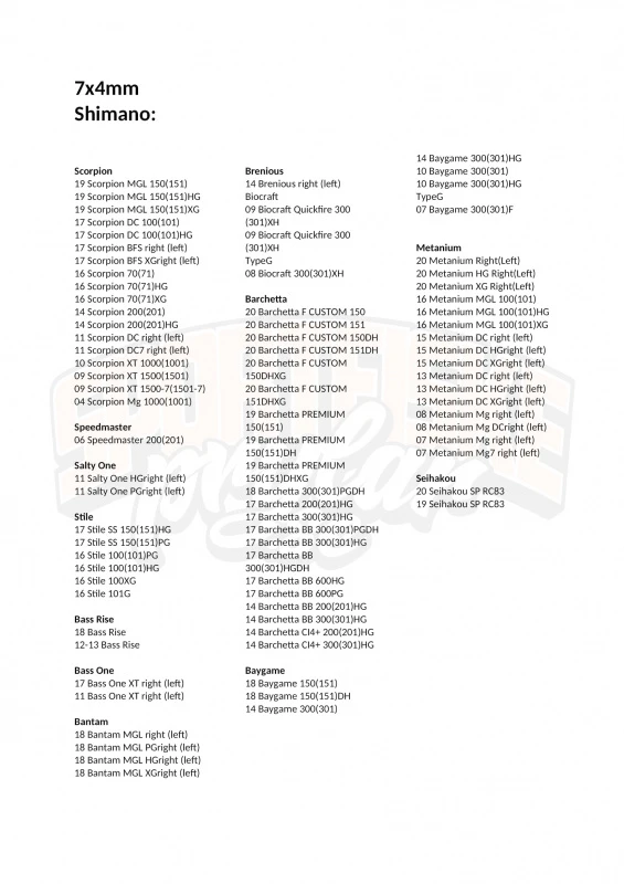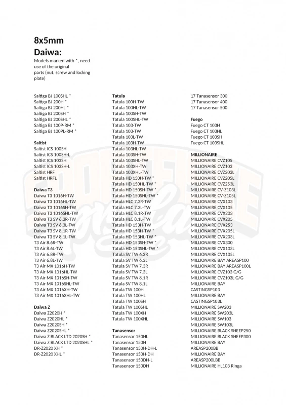 Admira, Blast, Daiwa SS, HRF, Ryoga, Advantage, Vadel, Alphas, IT’S, Aird, Catalina, Zillion, Steez, SPARTAN, Smak, Saltiga, Saltist, Daiwa T3, Daiwa Z, Tatula, Tanasensor, Fuego, MILLIONAIRE, Morethan, Light game ICV, KYOHGA, Kohga, Tatula TWS 300, 301