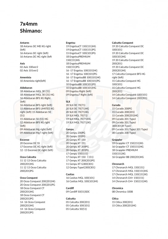 Antares, Axis, Amenista, Aldebaran, Excense, Ocea Calcutta, Ocea Conquest, Engetsu, SLX, Genpu, Casitas, Cardiff, Calcutta, Calcutta Conquest, Curado, Grappler, Chronarch, Chromica, Citica, Scorpion, Speedmaster, Salty One, Stile, Bass Rise, Bass One, Bantam, Brenious, Barchetta, Baygame, Metanium, Seihakou