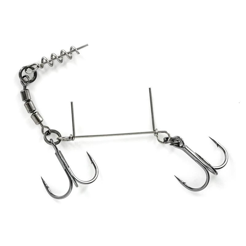 Het heeft een eenvoudig inschroefsysteem voor de tip en 2 pinnen gerealiseerd met een lange en sterke arm waarmee de rig aan de buik of aan de achterkant van het aas kan worden bevestigd. De hoogwaardige drievoudige wartel zorgt ervoor dat alles soepel verloopt en vermindert de onthaakproblemen tijdens het vissen.